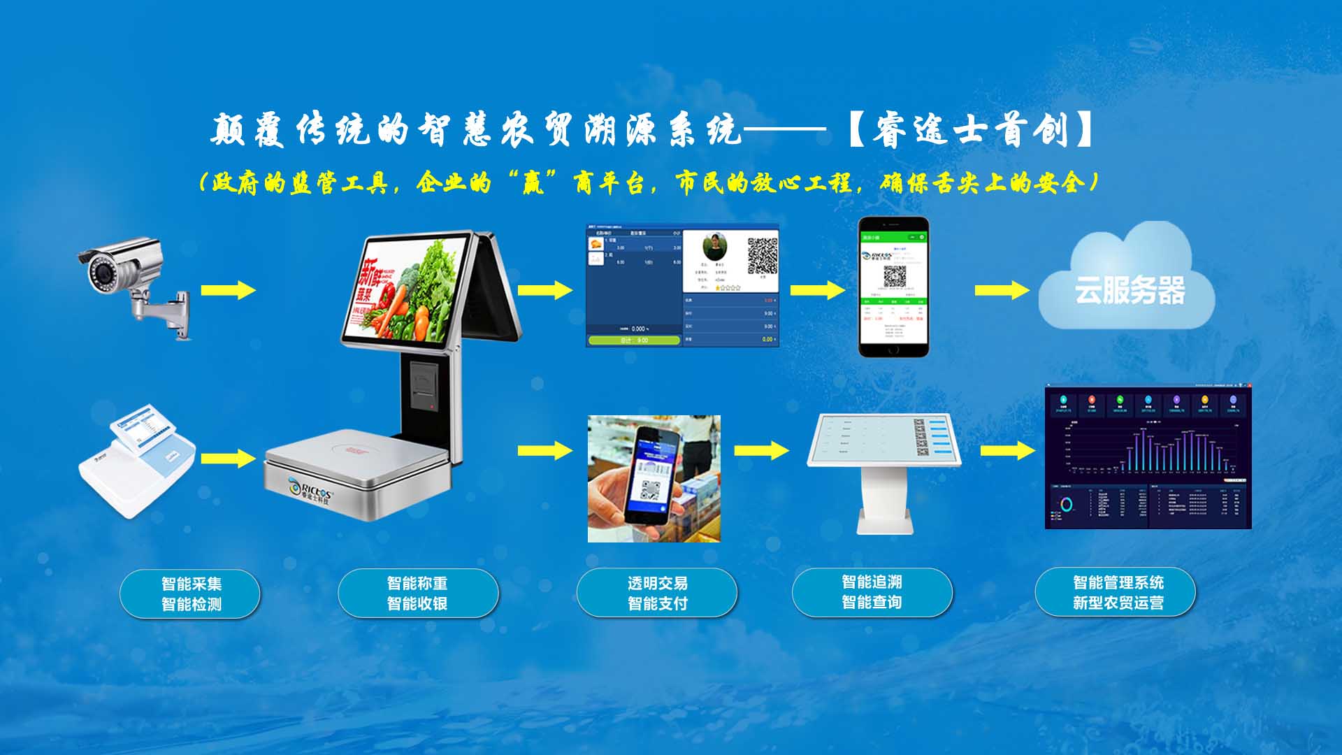 更具顛覆性的是睿途士智慧系統擁有三大管理平臺(市場管理平臺、總部運營管理平臺、商戶后臺管理平臺)、一個可視操作前臺和三大追溯功能,讓遠程管理、數據傳輸、人機互動、智能控制、移動支付、大數據、互聯通信、云端存儲、人工智能、智能城市、電子定位、智能收銀等功能得以實現。